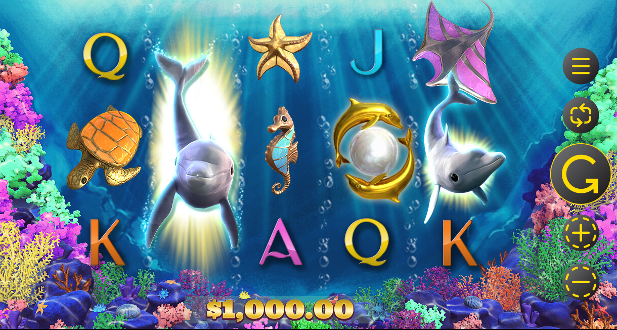 - Símbolo de bonificación – Delfines dorados con una perla. Al caer 3, 4 o 5 de estos símbolos se activan 10, 15 o 20 giros gratis respectivamente, además de un pequeño pago de 2x, 4,x o 10x de la apuesta;