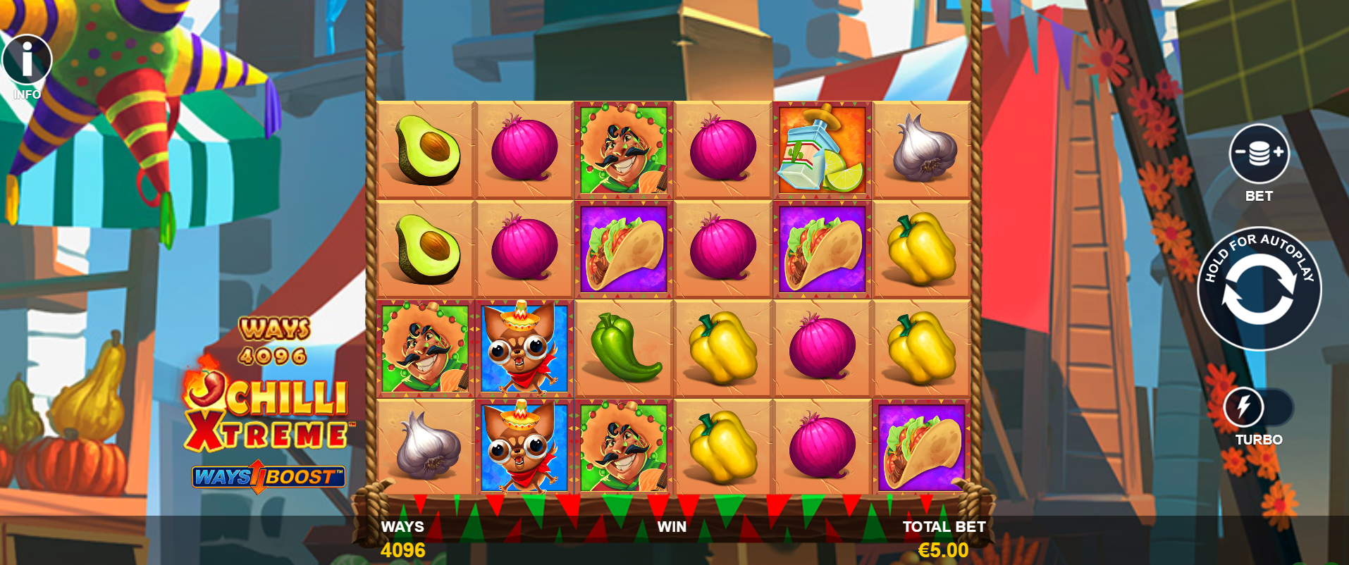 Chilli Xtreme tiene un diseño alegre y festivo. El tema está basado en una divertida fiesta mexicana. El fondo muestra una soleada calle de pueblo con adornos, chiles y luces que brillan intensamente. El Juego utiliza colores cálidos como el rojo, el amarillo y el naranja para crear un ambiente emocionante.