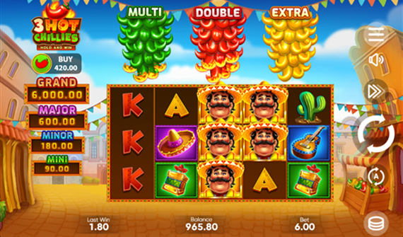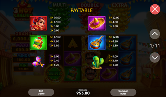 Os pagamentos de 3 Hot Chillies demo grátis ou com dinheiro de verdade são liberados quando ao menos duas imagens da mexicana aparecem em uma linha de pagamento válida ou três ou mais de quaisquer outros símbolos surgem nos rolos.