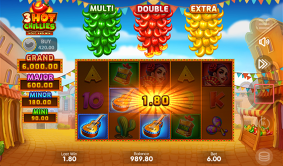O Multiplier do jogo 3 Hot Chillies é ativado quando as pimentas verdes ficam todas pegando fogo. Para isso acontecer, é preciso que sejam coletados símbolos verdes de bônus.