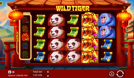 as linhas de pagamento do Wild Tiger não são fixas. É você que escolhe com quantas linhas de pagamento quer jogar! É possível escolher entre 20, 40, 60, 80 e 100 linhas.
