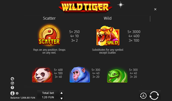 o pagamento máximo do Wild Tiger é 3.000x a aposta. Para conseguir essa recompensa, você precisa combinar os símbolos com melhor pagamento e ativar recursos como o scatter.