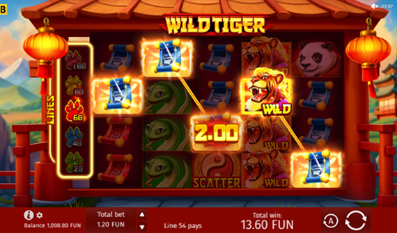 os melhores slots online têm um elemento de surpresa, não é mesmo? Por isso, o Wild Tiger oferece uma função inovadora de mudança de linhas de pagamento. Antes de iniciar a rodada, você pode editar o número de linhas para 20, 40, 60, 80 ou 100. O número que você escolher impacta o comportamento do jogo.