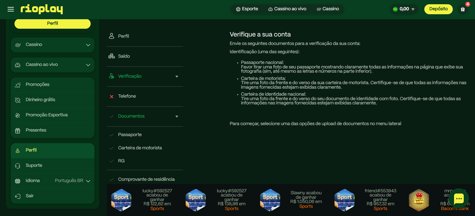 Dá para preencher os demais dados como endereço e até já verificar a conta com documentos assim que o cadastro é feito. Isso é opcional e a plataforma de cassino RioPlay não exige esse processo para o depósito.
