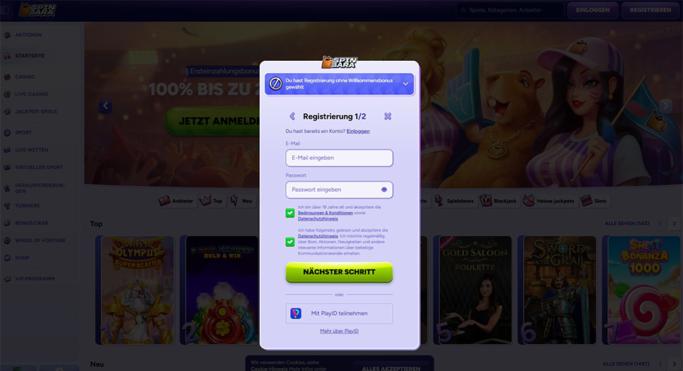 1. Webseite aufrufen: Besuche die offizielle SpinBara-Seite und klicke oben rechts auf „Registrieren“. Entscheide direkt, ob du einen Willkommensbonus nutzen möchtest, oder starte ohne Bonus.
