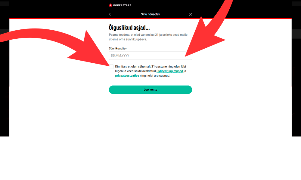 Sisestage oma sünnikuupäev ja kinnitage, et olete vähemalt 21-aastane. Märkige ruut, millega nõustute üldtingimustega ja privaatsusteatega.
