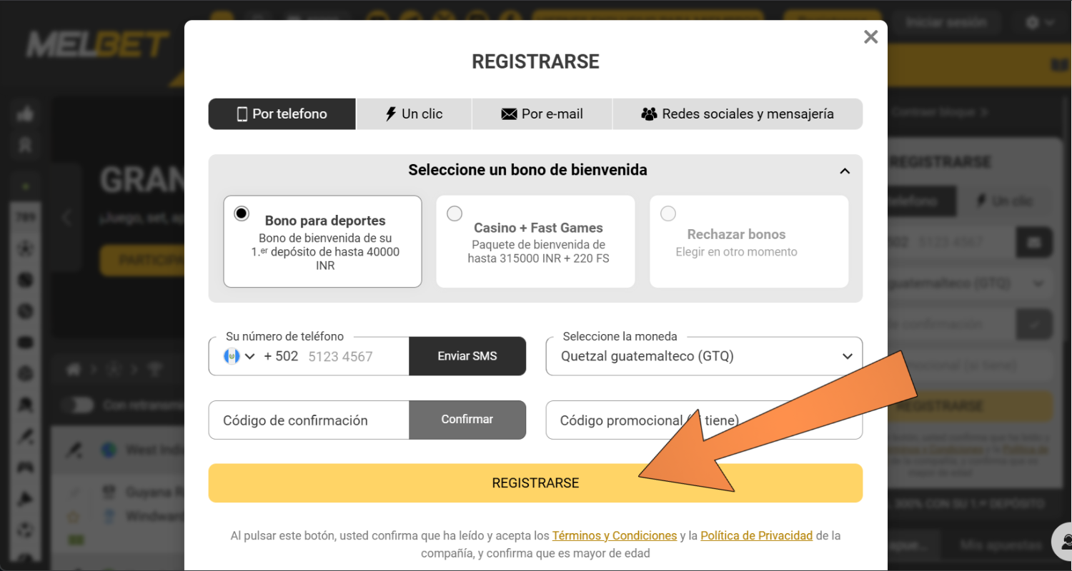 Seleccione uno de los 4 tipos de inscripción disponibles en Melbet: teléfono, 1-clic, correo electrónico o redes sociales;