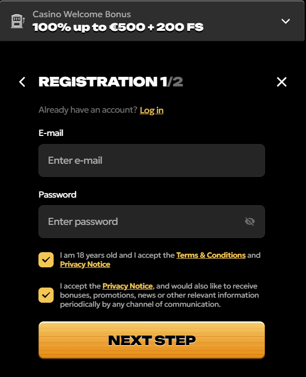 - Click Register or Sign Up on the homepage of the casino website.