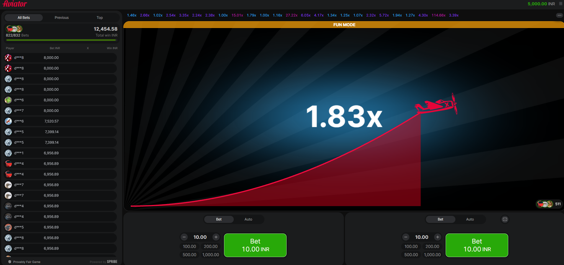 The history panel is at the top of the screen. It shows the multipliers that were reached in earlier rounds. With this tool, Indian players can: