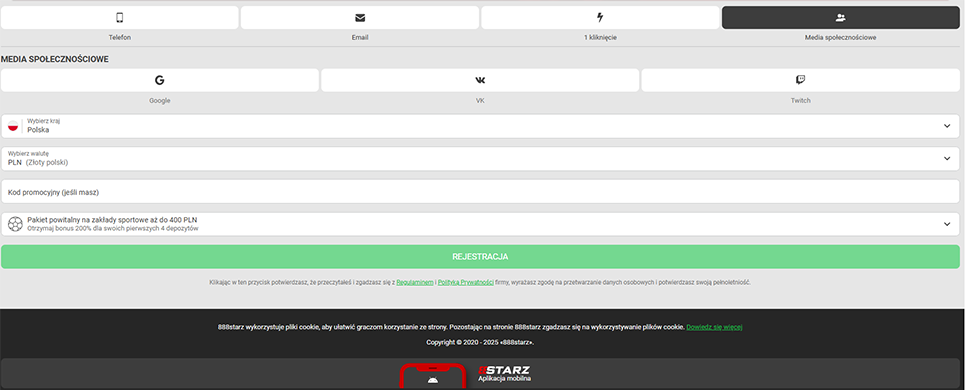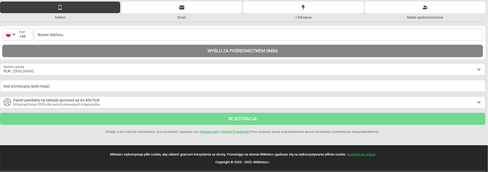 Sam proces wypełniania formularza przebiega płynnie: najpierw wybiera się jedną z powyższych metod, następnie uzupełnia dane w zależności od trybu, po czym wskazuje walutę oraz bonus powitalny (kasyno, zakłady sportowe lub brak bonusu). Dodatkowo istnieje możliwość wpisania kodu promocyjnego, który aktywuje dodatkowe korzyści. Rejestrację kończy kliknięcie zielonego przycisku „Rejestracja” i akceptacja regulaminu oraz polityki prywatności.
