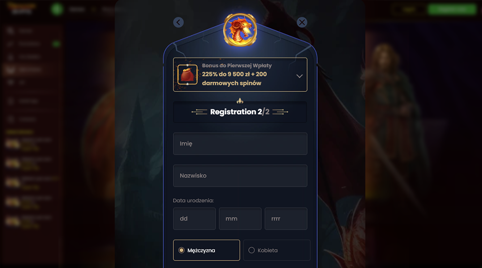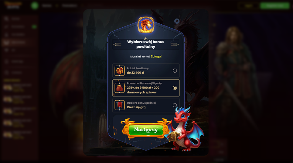 - Wybór bonusu powitalnego: na początku decydujesz, czy chcesz odebrać pakiet startowy, bonus do pierwszej wpłaty lub rozpocząć grę bez aktywacji bonusu w Dragonslots Kasyno.