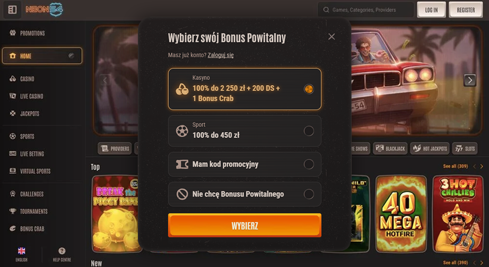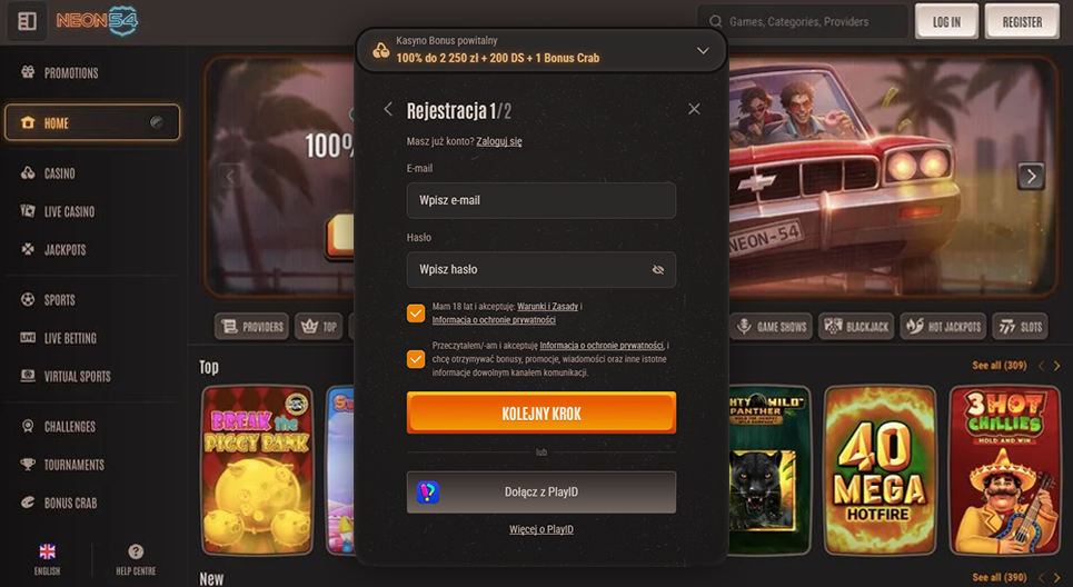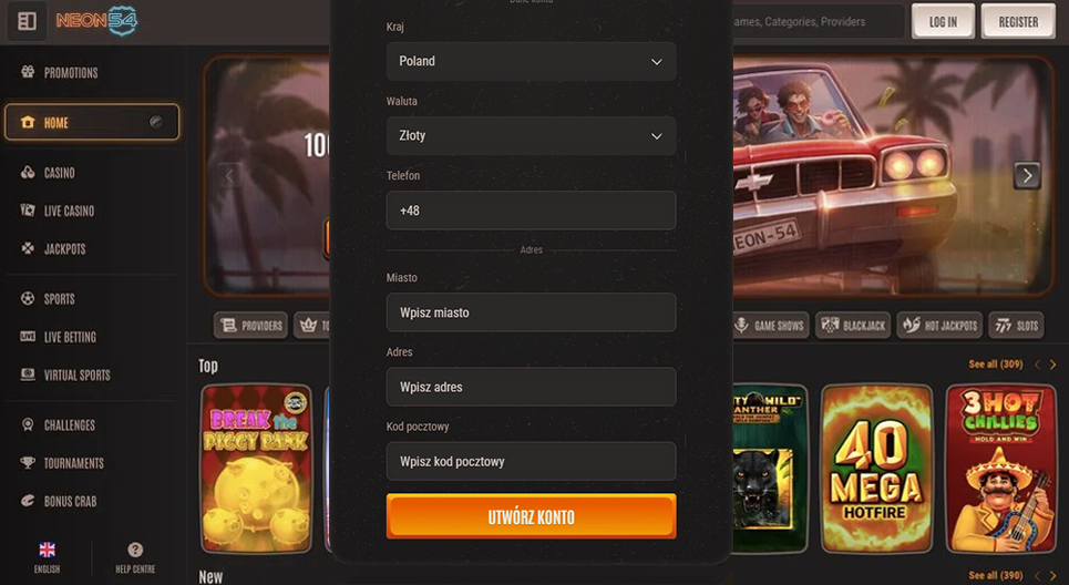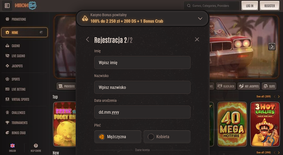 Sam proces rejestracji w Neon54 Kasyno przeszedłem bez najmniejszych problemów - okazał się szybki, prosty i w pełni intuicyjny.