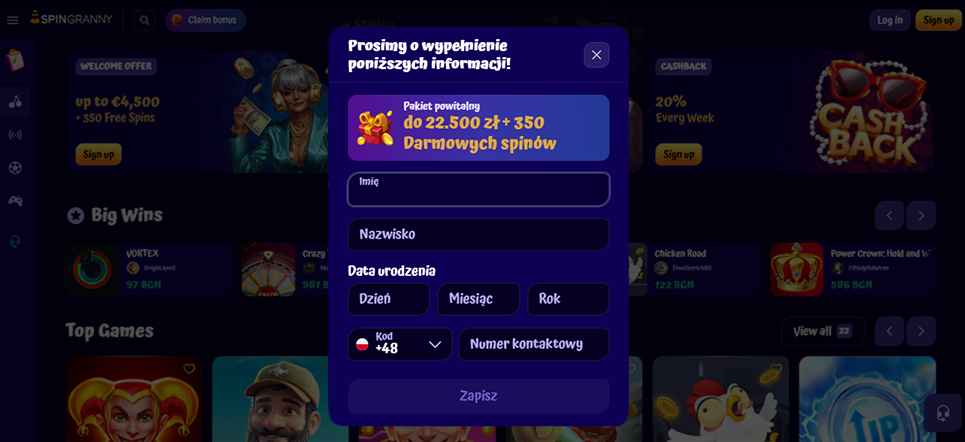 Sam przeszedłem proces zakładania konta w Spingranny Kasyno i mogę potwierdzić - rejestracja jest bardzo prosta i intuicyjna. Całość zajęła mi tylko kilka minut. Nie musiałem przedstawiać żadnych dokumentów, wszystko odbyło się online, w szybki i wygodny sposób. Oto kolejne kolejne kroki jakie wykonałem: